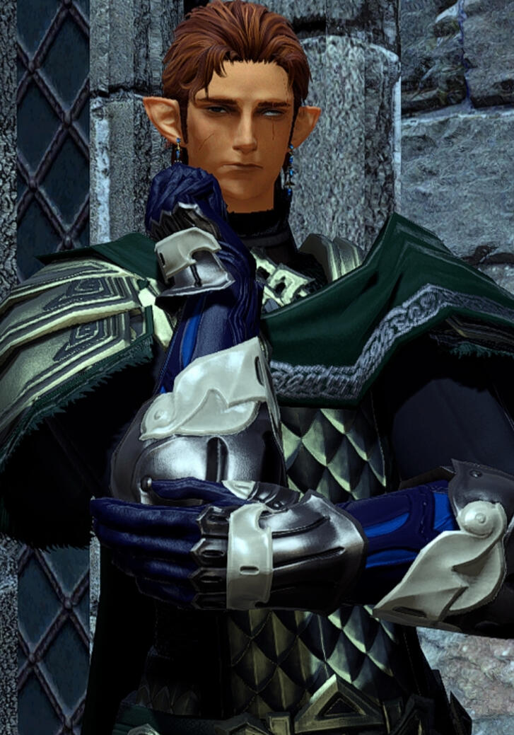 As a child, he was wild and mischievous, always wanting to play the hero. As an adult, he's strong and proud, always wanting to protect.Estienne, who prefers going by Symmonet to avoid being confused with his boss the Azure Dragoon, comes from a long line of proud knights and dragon slayers that started with a bastard son of House Dzmael. And over the course of a century, his family has certainly earned the respect in society to match such a heritage. Having been raised on stories of Halonic heroism and glory since he was a child, Symmonet has long been incredibly proud of his martial skills and his service to Ishgard. Amongst the many lessons that he learned from a young age, he was always taught that dying in the war against dragonkind was the most noble thing he could do and he was always prepared for the possibility of his death.Everything changed, however, when he made a mistake that saw his left eye lost to a dragon's spikes that tore straight through his helmet. The pain and shock threw him clean out of the sky, leaving him half-blind and badly injured. While he was recovering and adjusting to his new vision, the Dragonsong War came to an end and his services as a dragoon were no longer needed.In his shock and anger, he fell into a deep depression that spiraled into a full-blown crisis of faith and a lack of self as he saw his entire life's purpose ripped out from under him, the sacrifices of his himself and his kin rendered worthless. They had fought all this time to kill dragon and Dravanian alike, why were those same enemies being invited to break bread at their tables now? What the hell kind of peace even was this?Since then, he's found a position as a knight of the formerly agricultural House Chastelaine and works to find other ways to serve Ishgard and the people in it. All the while, he's still stumbling around and trying to find his footing and his purpose once more in strange new reality he's found himself in.